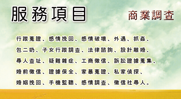 徵信調查的服務項目包含了:行蹤蒐證、感情挽回、感情破壞、外遇、抓姦、包二奶、子女行蹤調查、法律諮詢、設計離婚、尋人查址、疑難雜症、工商徵信、訴訟證據蒐集、婚前徵信、證據保全、家暴蒐證、私家偵探、婚姻挽回、手機監聽、感情調查、徵信社尋人。